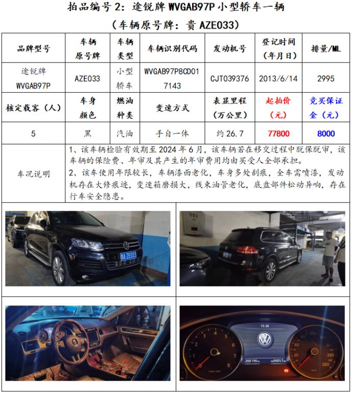 拍品編號(hào)2:途銳牌WVGAB97P小型轎車一輛(車輛原號(hào)牌:貴AZE033)