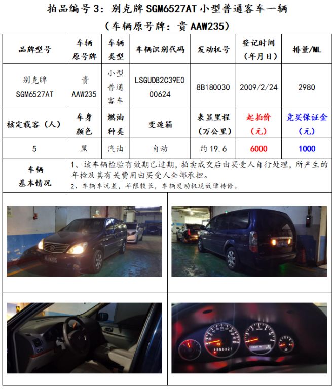 拍品編號(hào)3:別克牌SGM6527AT小型普通客車一輛(車輛原號(hào)牌:貴AAW235)