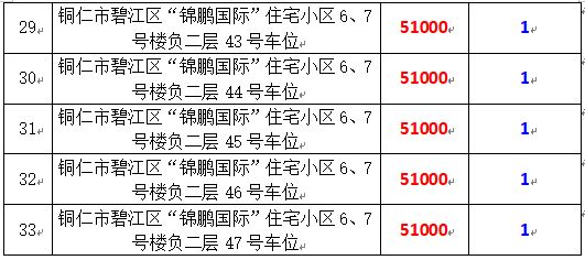 拍品編號15-33:銅仁市碧江區(qū)“錦鵬國際”住宅小區(qū)6、7號樓負(fù)一層:32號、35號、53號,負(fù)二層:32號-47號共計(jì)19個車位