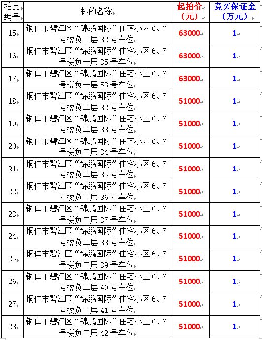 5、銅仁市碧江區(qū)“錦鵬國際”住宅小區(qū)6、7號樓負(fù)一層;32號、35號、53號,負(fù)二層;32號-47號共計(jì)19個車位,起拍價:51000元-63000元,競買保證金:1萬元/個。