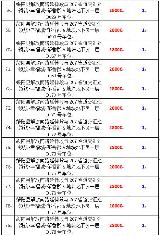 1、標(biāo)的坐落于綏陽縣解放南路延伸段與207省道交匯處領(lǐng)航?幸福城?郁香郡A地塊地下負(fù)一層。標(biāo)的總數(shù)為170個車位,水電設(shè)施齊全。