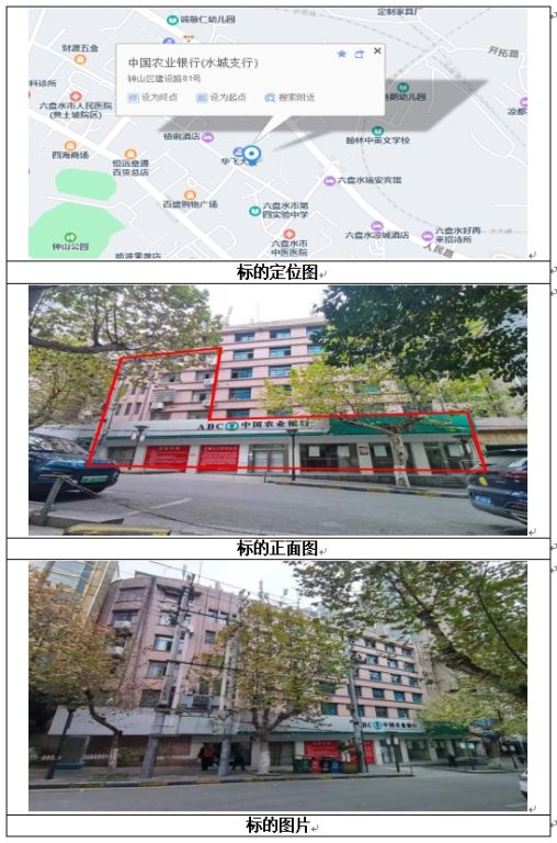 標(biāo)的位于六盤(pán)水市鐘山區(qū)建設(shè)東路20號(hào),建筑面積為1233.75平方米,混合結(jié)構(gòu),總樓層數(shù)為7層,所在樓層數(shù)為1至6層,設(shè)計(jì)用途為商業(yè)。