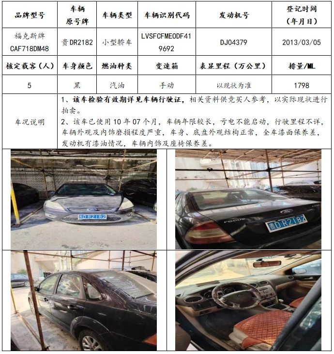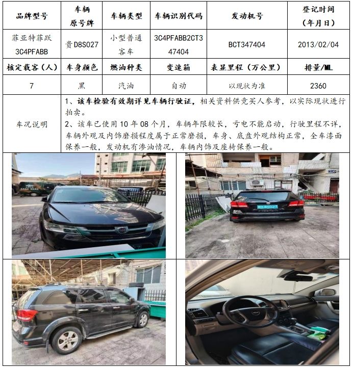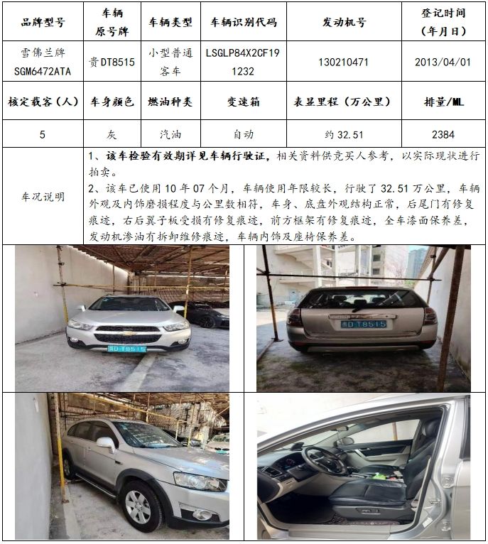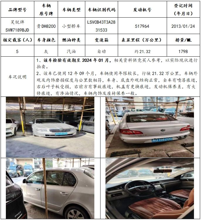 拍品編號1:菲亞特牌、福克斯牌、雪佛蘭牌、昊銳牌等共4輛(整體拍賣)。一、展樣時間:公告之日起至2023年12月15日(工作日上午9:00—下午17:00)二、展樣地點:標的物所在地(請聯(lián)系我公司查看標的)三、報名時間:公告之日起至2023年12月19日12:00(以保證金到賬時間為準。)(https://paimai.caa123.org.cn/pages/meeting/conference.html?id=253855)1、請在中拍平臺上完成注冊登記,并上傳有效身份證明進行實名認證(個人:身份證原件;企業(yè):營業(yè)執(zhí)照、法人身份證照片)2、意向競買人應在規(guī)定報名時間內(nèi)交納競買保證金及資料服務費300元/輛(資料服務費不退)到我公司指定銀行賬戶,取得競買資格。六、其他說明:為保證報名成功,避免轉(zhuǎn)賬失敗等情況,競買人轉(zhuǎn)賬后請及時與我公司聯(lián)系,確認其競買資格。七、公司地址:貴州省貴陽市南明區(qū)中華南路20號新大陸廣場10樓D座