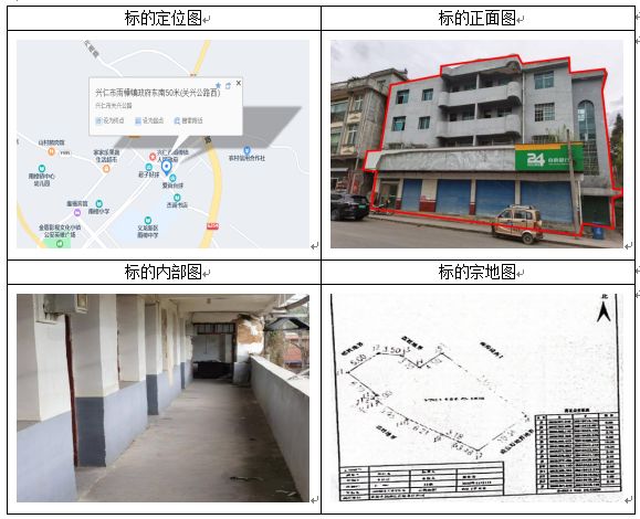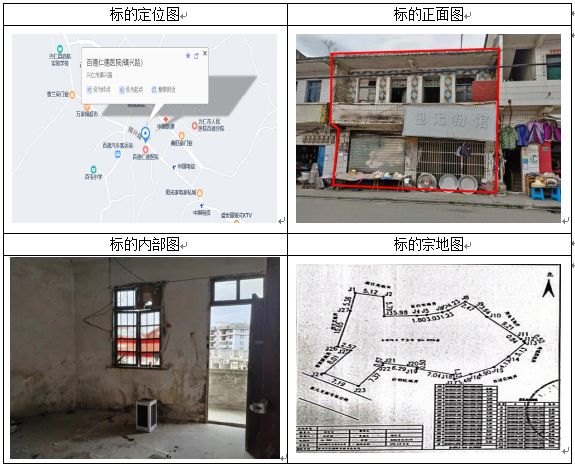標(biāo)的坐落于貴州省興仁市屯腳鎮(zhèn)街上,房屋總層數(shù)4層,共有宗地面積401.37㎡,房屋建筑面積:607.4㎡,房屋結(jié)構(gòu):混合結(jié)構(gòu),房屋產(chǎn)權(quán)證號(hào):黔(2023)興仁市不動(dòng)產(chǎn)權(quán)第0005222號(hào),權(quán)利類型:國(guó)有建設(shè)用地使用權(quán)/房屋所有權(quán),權(quán)利性質(zhì):出讓/自建房,用途:商務(wù)金融用地/商業(yè)、金融、信息,使用期限:2012年9月29日起2052年9月28日止。