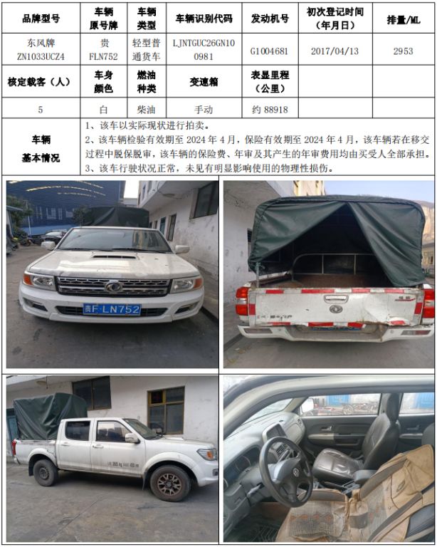 豐田牌JTEBX3F小型越野客車、東風(fēng)牌ZN1033UCZ4輕型普通貨車,共2輛,整體拍賣。