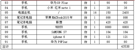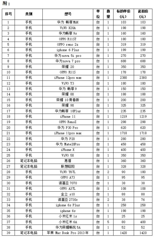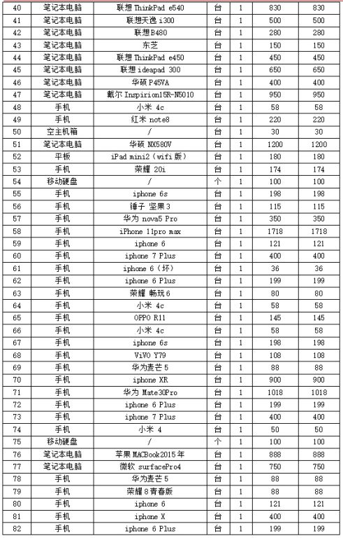“手機(jī)、電腦、等電子相關(guān)設(shè)備”一批(整體拍賣),各類品牌手機(jī)76部、筆記本電腦16臺、移動硬盤2個、電腦主機(jī)16臺、空主機(jī)箱1個、平板1臺)(詳見后附清單)。