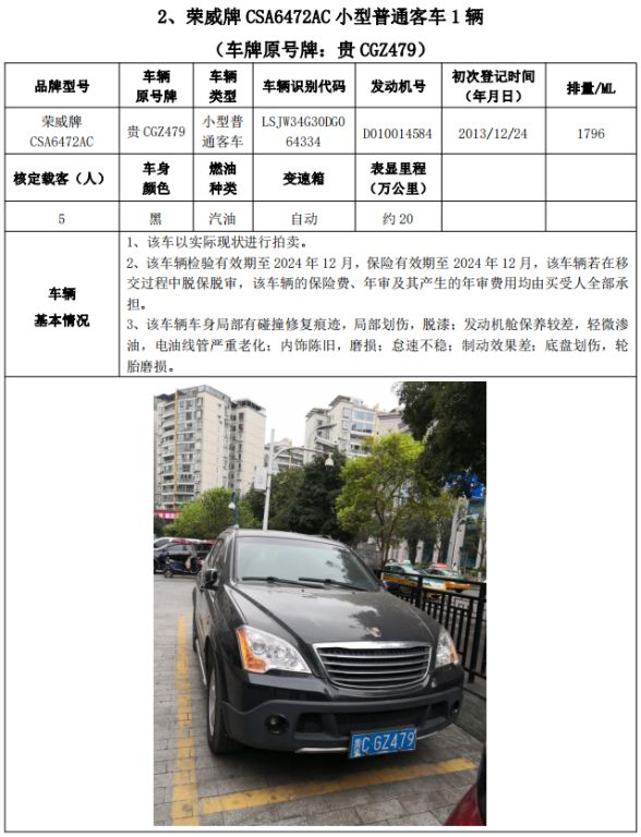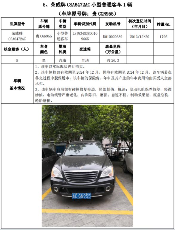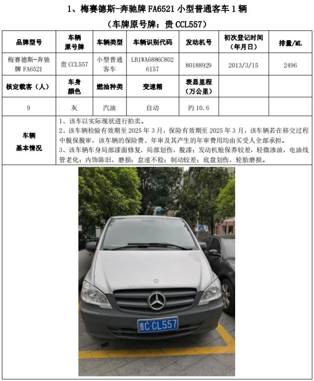 拍品編號2:梅賽德斯-奔馳牌FA6521小型普通客車1輛、榮威牌CSA6472AC小型普通客車3輛、雪佛蘭牌SGM6470TAAD小型普通客車1輛,共計5輛,整體拍賣