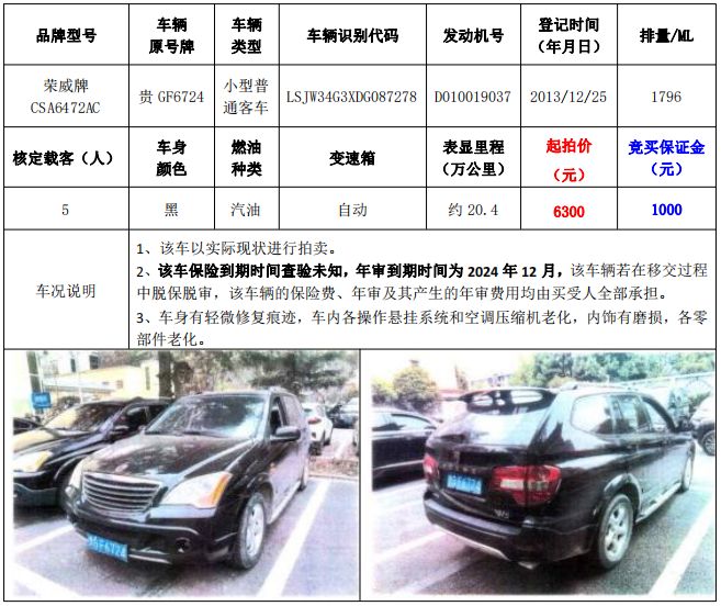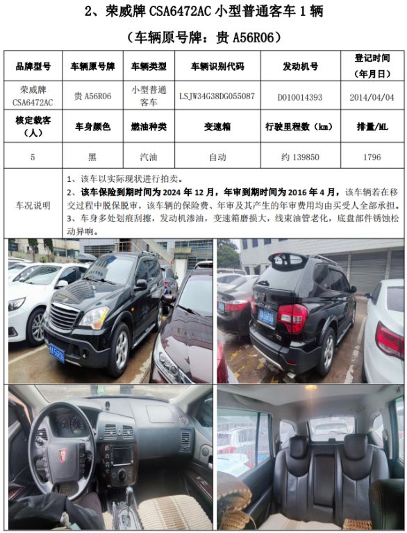 拍品編號(hào)3:榮威牌CSA6472AC小型普通客車(chē)1輛