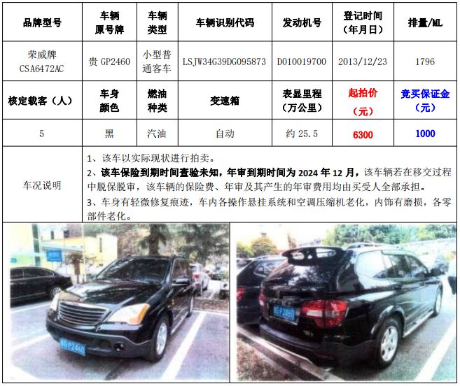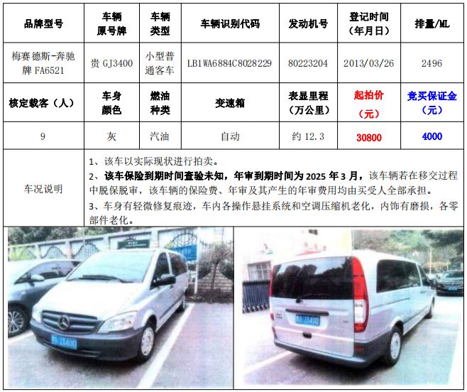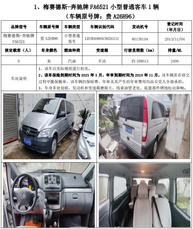 拍品編號(hào)1:梅賽德斯-奔馳牌FA6521小型普通客車(chē)1輛、榮威牌CSA6472AC小型普通客車(chē)1輛,共計(jì)2輛(整體拍賣(mài))