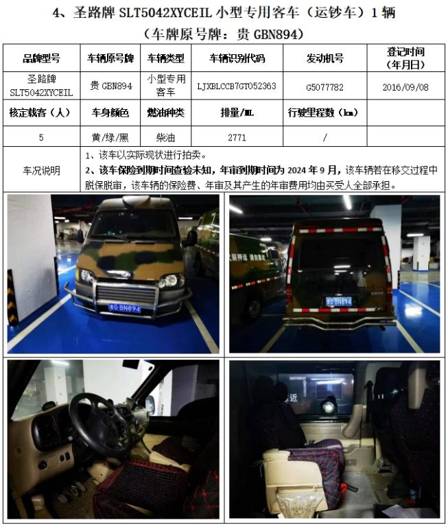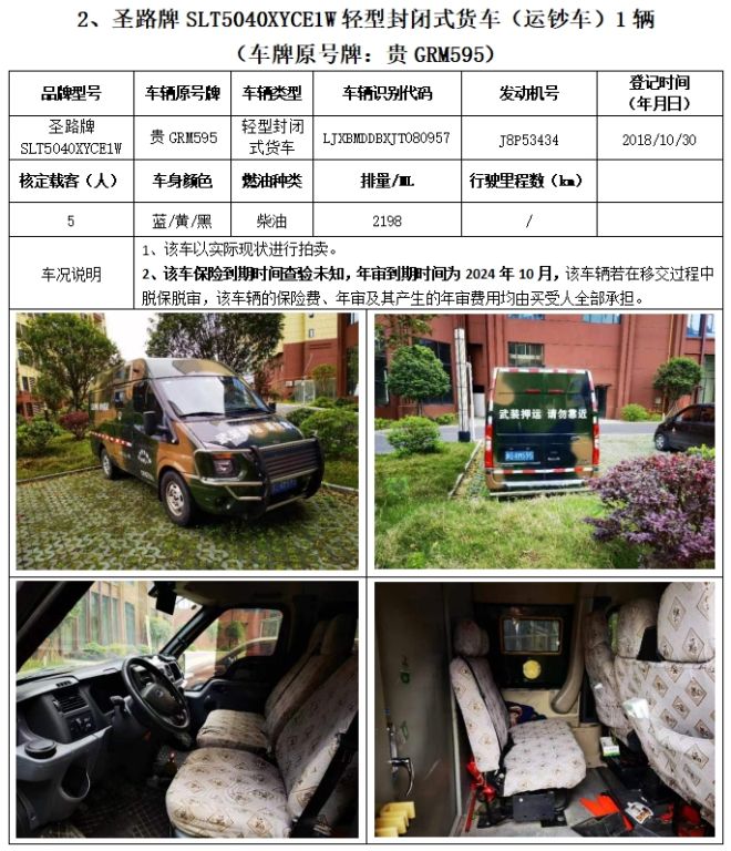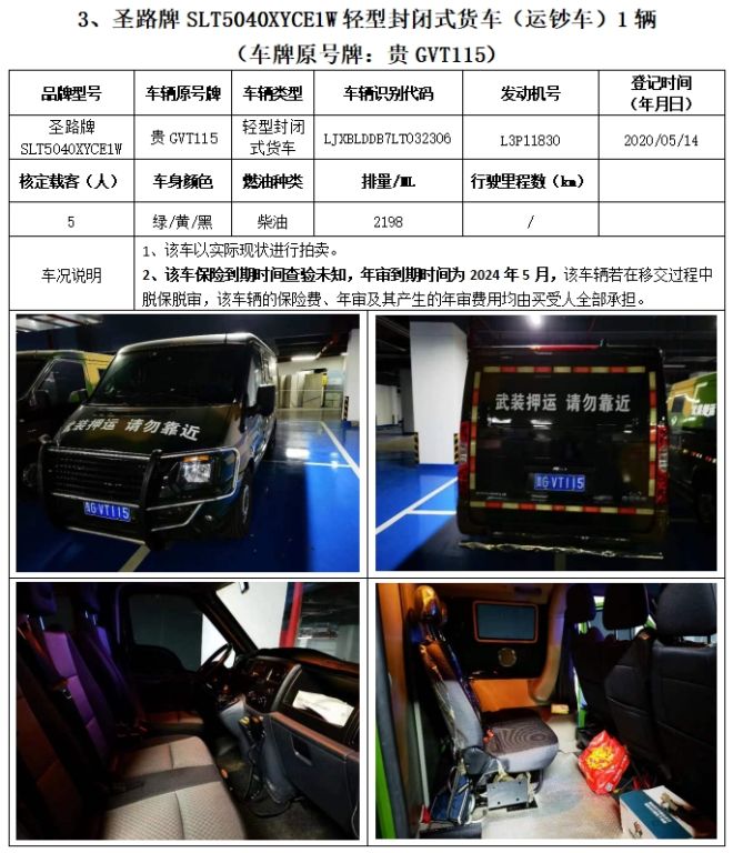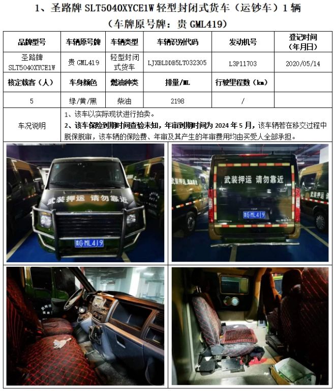 拍品編號(hào)1:圣路牌SLT5040XYCE1W輕型封閉式貨車(chē)(運(yùn)鈔車(chē))3輛、圣路牌SLT5042XYCEIL小型專(zhuān)用客車(chē)(運(yùn)鈔車(chē))1輛,共4輛,整體拍賣(mài)