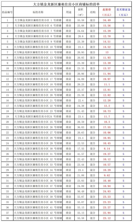 1、大方鎮(zhèn)金龍新區(qū)廉租住房小區(qū)38間商鋪(1,6-11,13-43號(hào)),建筑面積:17.55㎡-56.49㎡,起拍價(jià):8.14萬(wàn)元-34.49萬(wàn)元,競(jìng)買保證金:5萬(wàn)元。