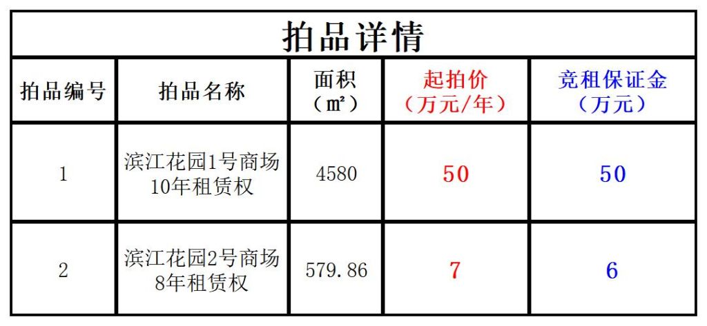 1、濱江花園1號(hào)商場(chǎng)10年租賃權(quán),面積:4580㎡,起拍價(jià):50萬(wàn)元/年,競(jìng)租保證金:50萬(wàn)元(自第4年起租金按年租金的3%逐年遞增);
