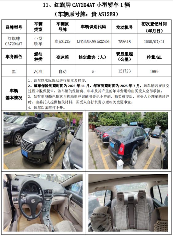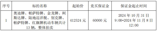拍品編號1:奧迪牌、帕薩特牌、金龍牌、柯斯達牌、陸地巡洋艦、別克牌、帕薩特牌、紅旗牌機動車輛共計13輛,整體拍賣