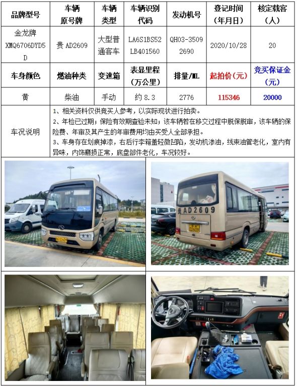拍品編號1:金龍牌XMQ6706DYD5D大型普通客車一輛