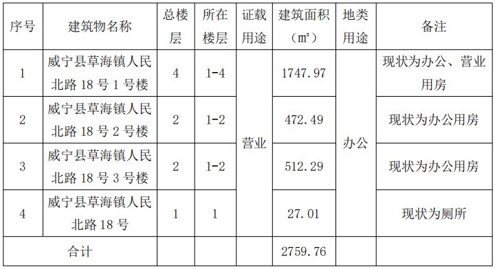 標(biāo)的坐落于威寧縣草海鎮(zhèn)人民北路18號稱為1號樓、2號樓和3號樓的三項房屋,房屋建筑面積為:2759.76㎡,混合結(jié)構(gòu),房屋總層數(shù)為4層,拍賣標(biāo)的所在層數(shù)為1-4層,產(chǎn)權(quán)證號:威房權(quán)證草海鎮(zhèn)字第00007730號,設(shè)計用途為營業(yè)。土地證號:威國用(2009)第133號,地類(用途):辦公用地,使用權(quán)類型:作價出資,使用權(quán)面積:1854.70㎡。
