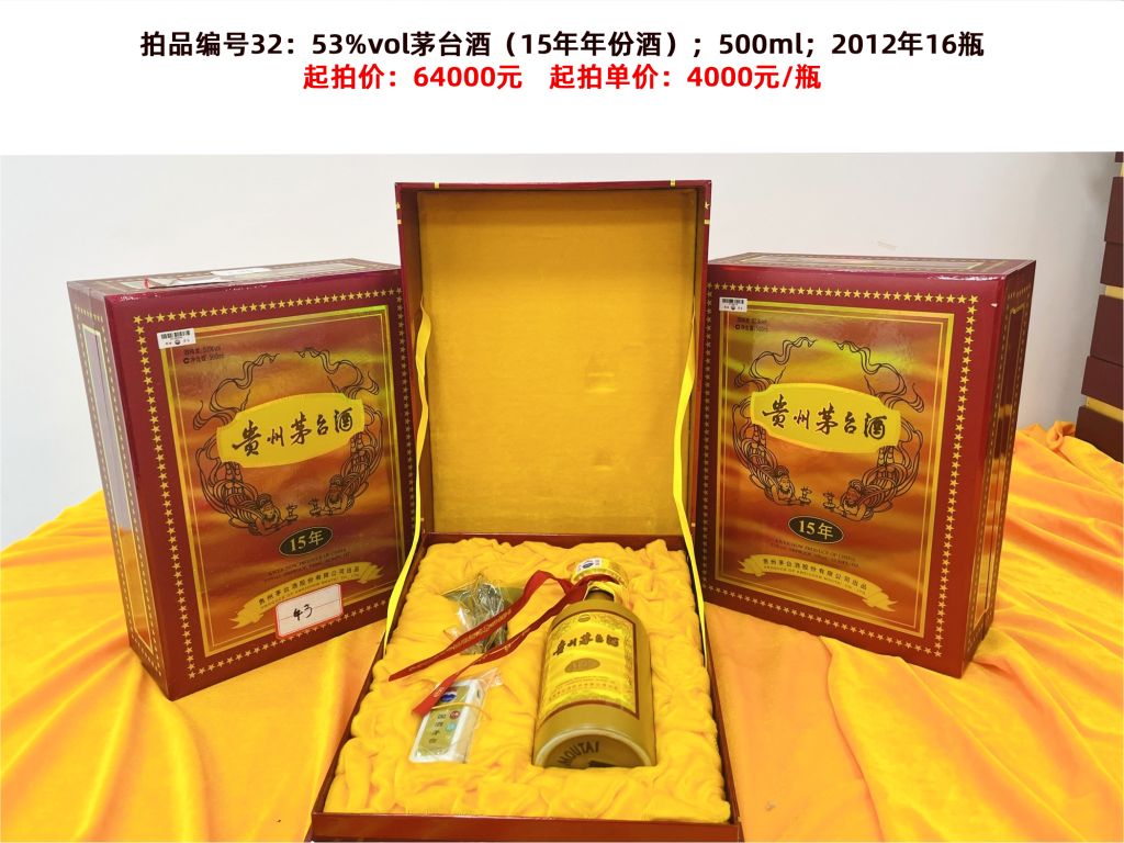 罰沒物品——貴州茅臺酒約2200瓶(其中有各類茅臺酒及各類生肖酒、15年、30年、50年年份酒,還有巴拿馬90周年紀(jì)念酒、世博紀(jì)念酒及多款特制紀(jì)念酒),詳見《拍賣標(biāo)的清單》。