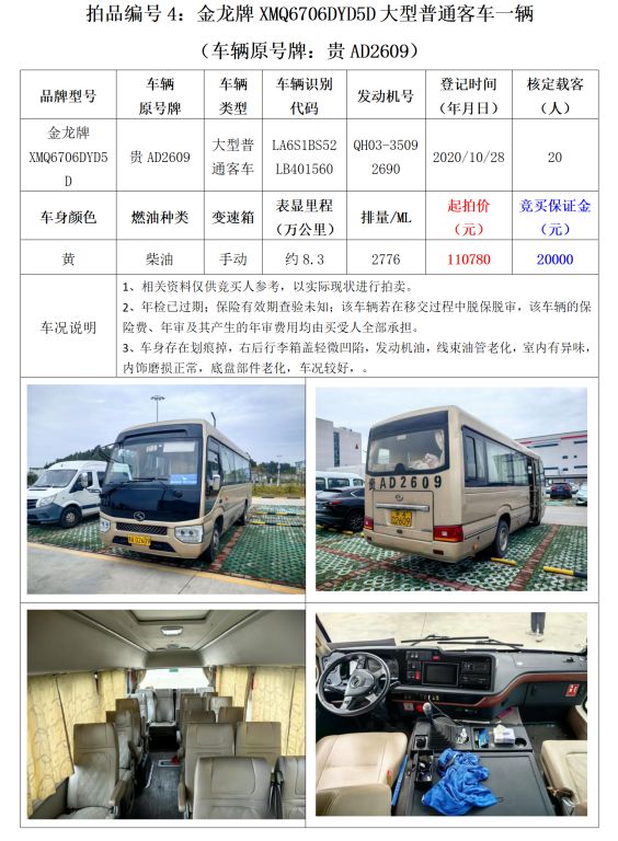 4、金龍牌XMQ6706DYD5D大型普通客車1輛。