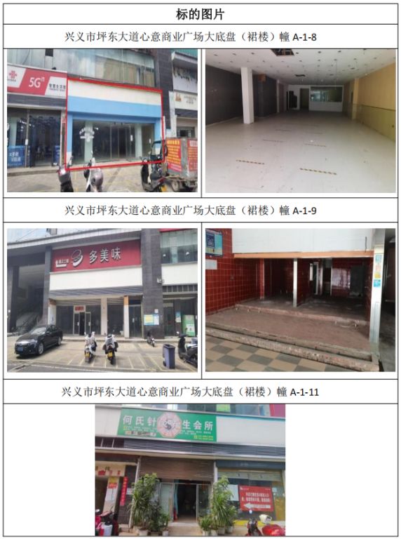 拍品編號1:興義市坪東大道心意商業(yè)廣場大底盤(裙樓)幢A-1-8、A-1-9、A-1-11、A-1-12商業(yè)用房4間,整體拍賣