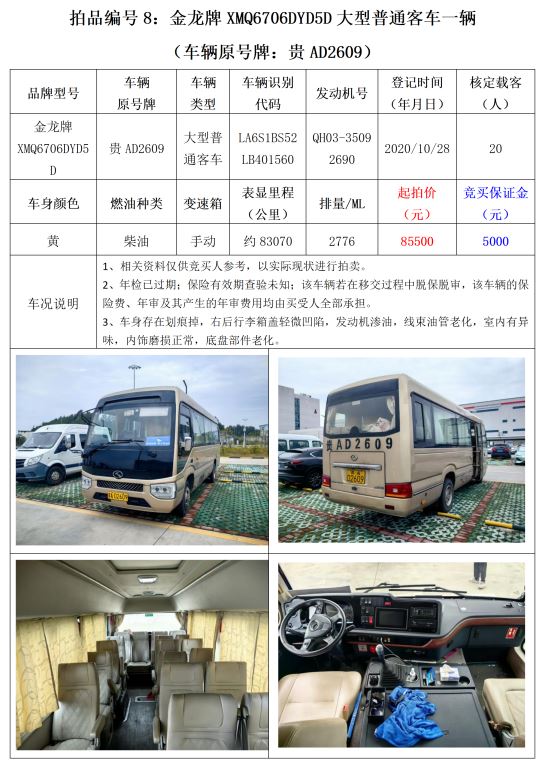6、金龍牌XMQ6706DYD5D大型普通客車1輛。