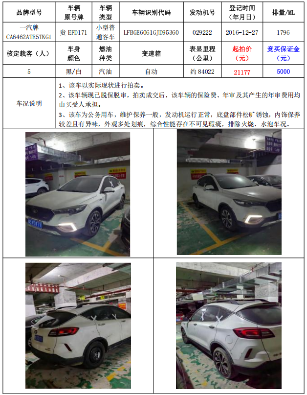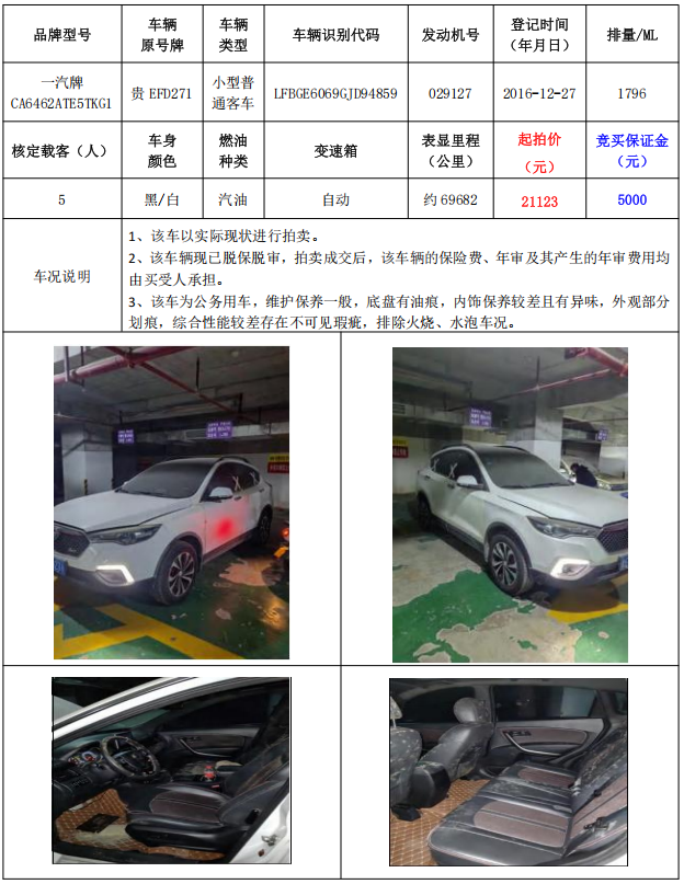 拍品編號(hào)4:一汽牌CA6462ATE5TKG1小型普通客車1輛