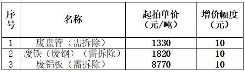 該標的為整體拍賣,以第1項廢盤管(需拆除)起拍單價1330元/噸進行競價,采取增價方式競拍,每次每噸加價10元,上不封頂;廢盤管(需拆除)每增加10元/噸,第2、3項廢舊物資同步增加10元/噸。