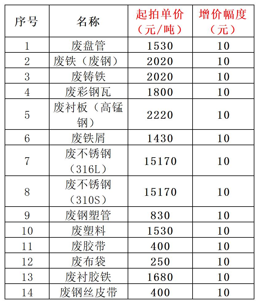 該標的為整體拍賣,以第1項廢盤管起拍單價1530元/噸進行競價,采取增價方式競拍,每次每噸加價10元,上不封頂;廢盤管每增加10元/噸,第2-14項廢舊物資同步增加10元/噸。