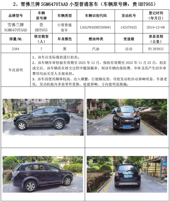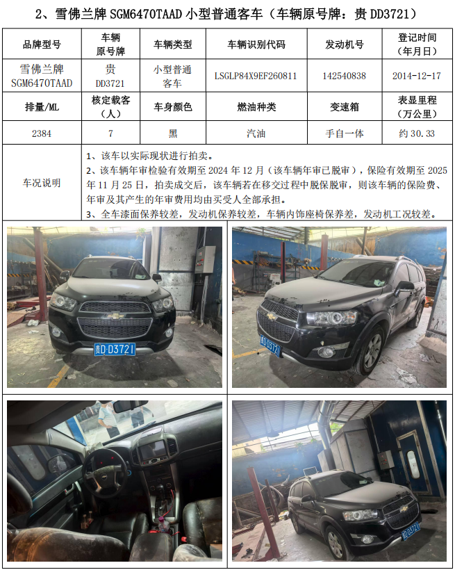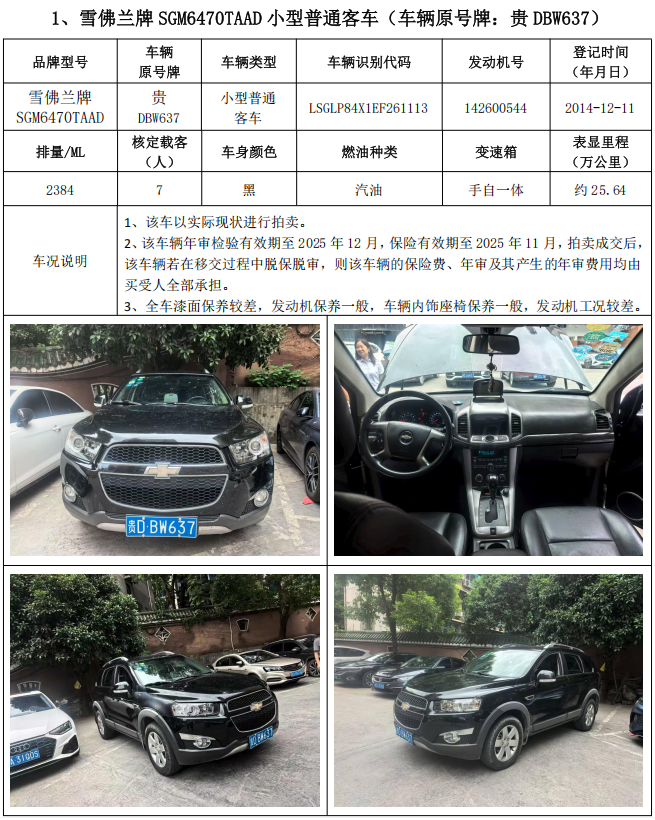 1、雪佛蘭牌SGM6470TAAD小型普通客車(chē)2輛,整體拍賣(mài),起拍價(jià):14100元,競(jìng)買(mǎi)保證金:5000元;