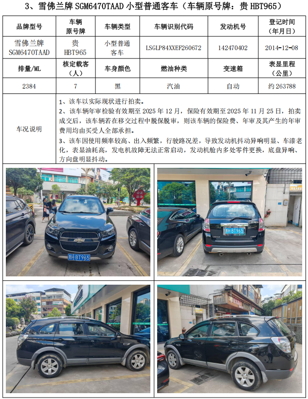 2、雪佛蘭牌SGM6470TAAD小型普通客車(chē)3輛,整體拍賣(mài),起拍價(jià):22221元,競(jìng)買(mǎi)保證金:5000元。