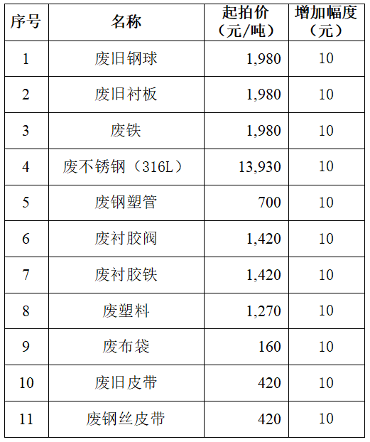 該標(biāo)的為整體拍賣,以第1項(xiàng)廢舊鋼球起拍單價(jià)1980元/噸進(jìn)行競價(jià),采取增價(jià)方式競拍,每次每噸加價(jià)10元,上不封頂;廢舊鋼球每增加10元/噸,第2-11項(xiàng)廢舊材料同步增加10元/噸。