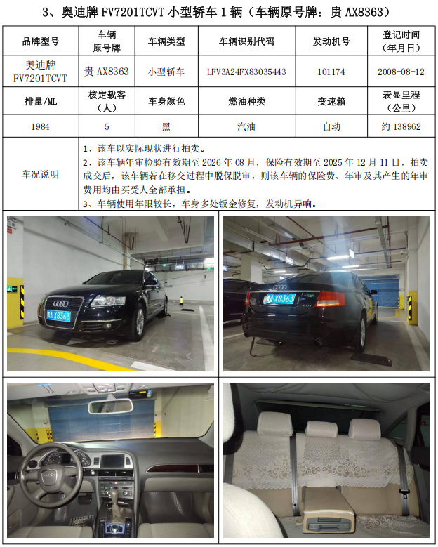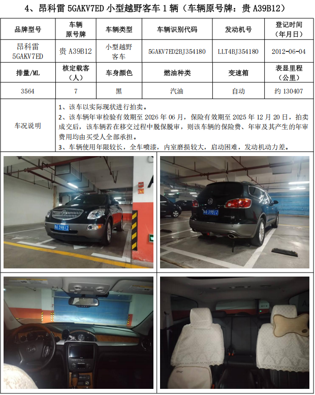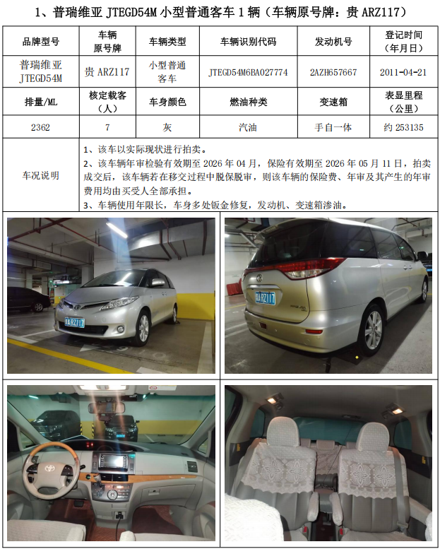 拍品編號1:普瑞維亞小型普通客車1輛、奧迪牌小型轎車2輛、昂科雷小型越野客車2輛,共計5輛,整體拍賣