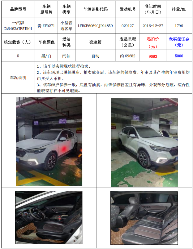 拍品編號1:一汽牌CA6462ATE5TKG1小型普通客車1輛(車輛原號牌:貴EFD271)