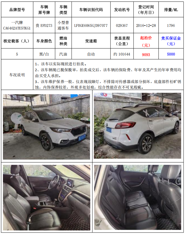 拍品編號3:一汽牌CA6462ATE5TKG1小型普通客車1輛(車輛原號牌:貴EFD273)
