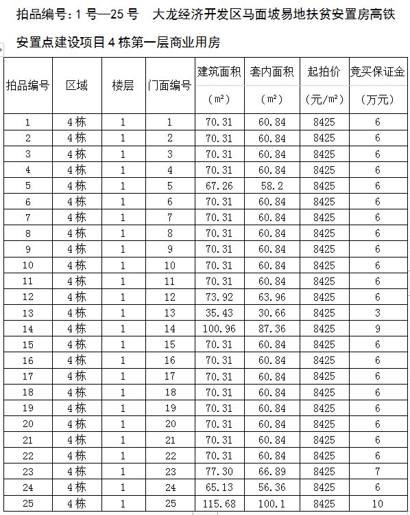 1、大龍經(jīng)濟(jì)開發(fā)區(qū)馬面坡易地扶貧安置房高鐵安置點(diǎn)建設(shè)項(xiàng)目4棟第一層商業(yè)用房25間,建筑面積為35.43㎡-115.68㎡,起拍價(jià):8425元/㎡,競(jìng)買保證金3—10萬(wàn)元/間;