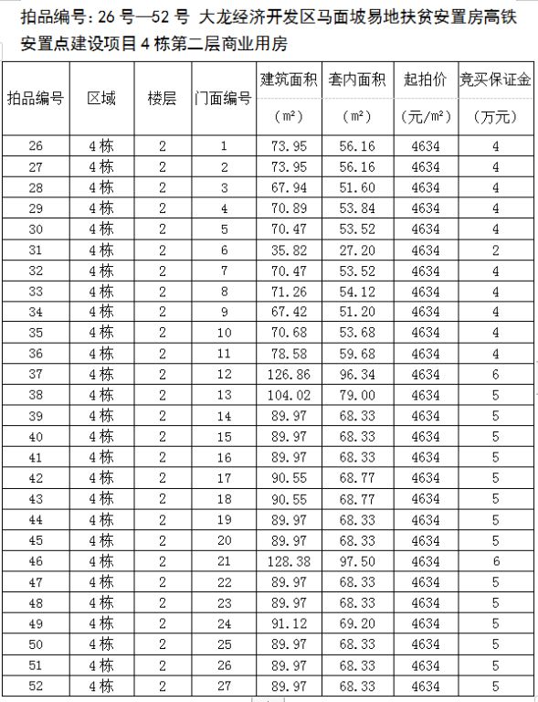 3、大龍經(jīng)濟(jì)開發(fā)區(qū)馬面坡易地扶貧安置房高鐵安置點(diǎn)建設(shè)項(xiàng)目4棟第三層商業(yè)用房23間,建筑面積為54.88㎡-102.06㎡,起拍價(jià):3370元/㎡,競(jìng)買保證金2—4萬(wàn)元/間;