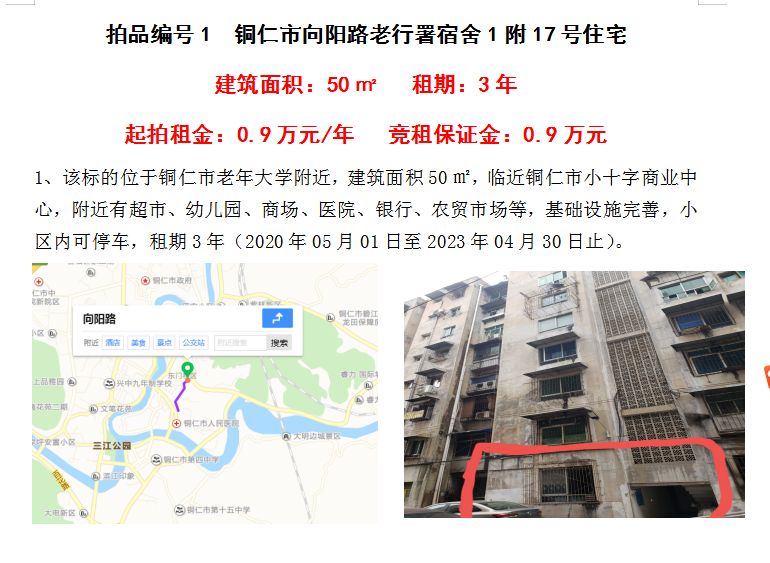 1、銅仁市向陽路老行署宿舍1附17號住宅3年租賃權(quán)(建筑面積:50㎡);起拍租金單價(jià):0.90萬元/年;競租保證金:0.90萬元;