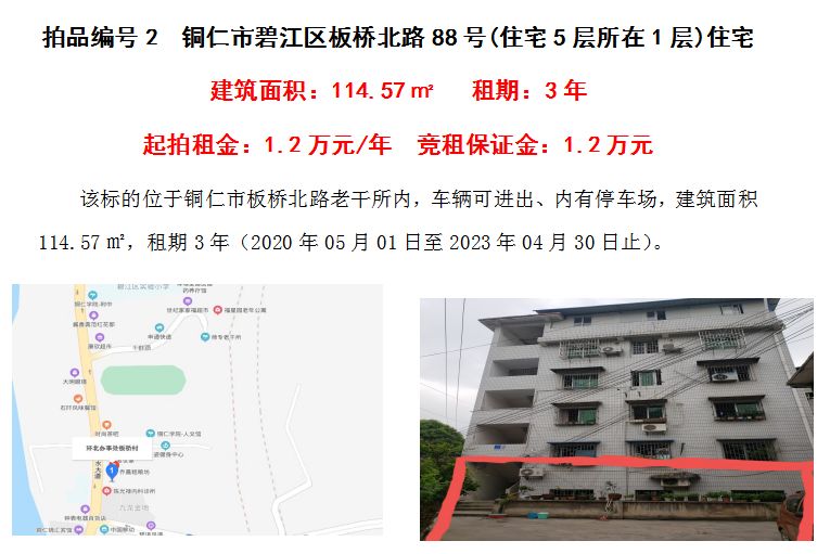 2、銅仁市碧江區(qū)板橋北路88號(住宅5層所在1層)住宅3年租賃權(quán)(建筑面積:114.57㎡);起拍租金單價(jià):1.20萬元/年;競租保證金:1.20萬元;