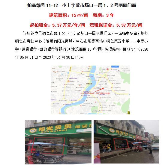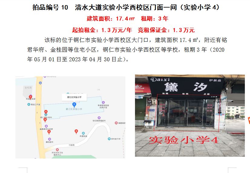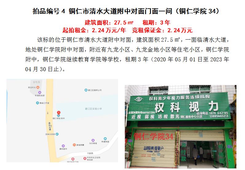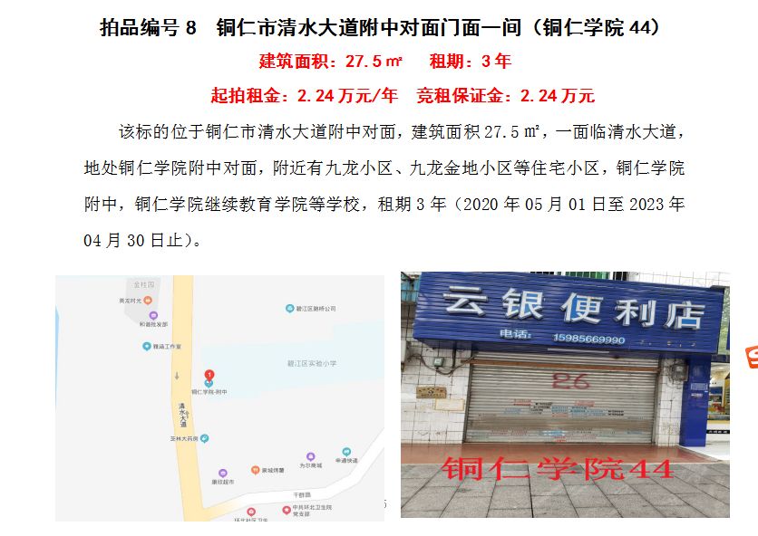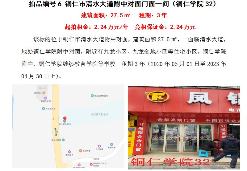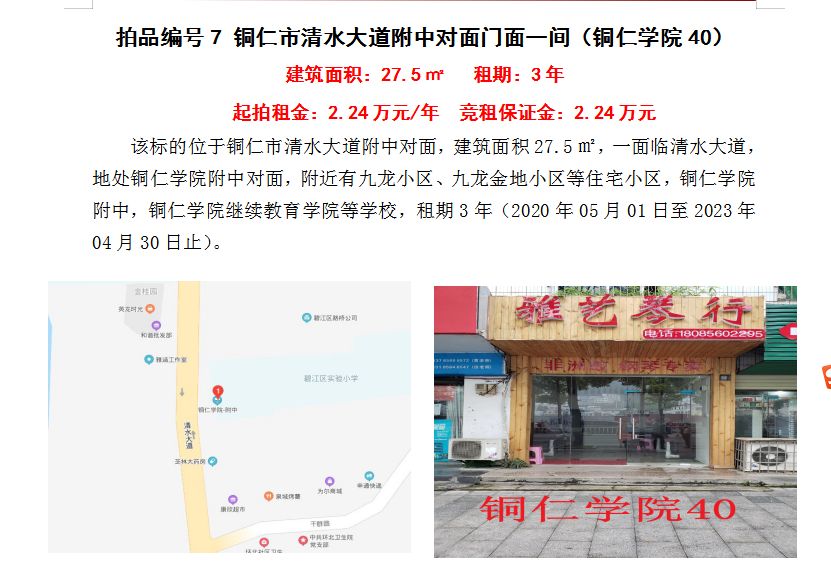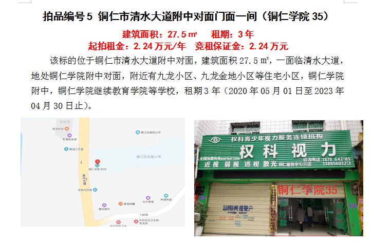 4、銅仁市清水大道附中對面門面五間3年租賃權(quán)(建筑面積:27.5㎡/間);起拍租金單價(jià)(每間):2.24萬元/年;競租保證金(每間):2.24萬元;