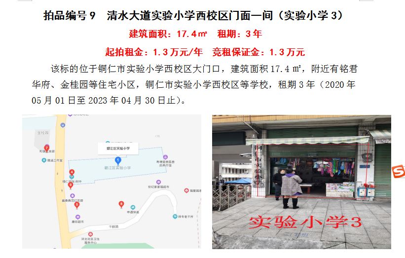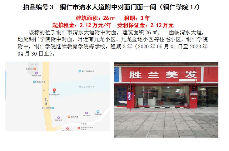 3、銅仁市清水大道附中對面門面一間3年租賃權(quán)(建筑面積:26㎡);起拍租金單價(jià):2.12萬元/年;競租保證金:2.12萬元;