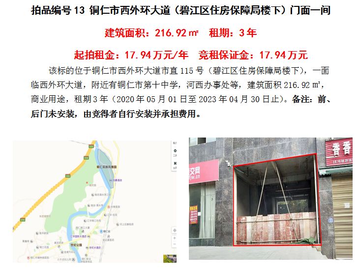 7、銅仁市西外環(huán)大道(碧江區(qū)住房保障局樓下)門面一間3年租賃權(quán)(建筑面積:216.92㎡);起拍租金單價(jià):17.94萬元/年;競租保證金:17.94萬元;