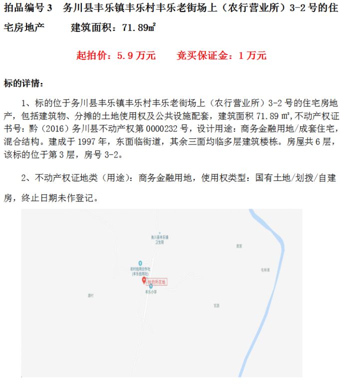 三、務(wù)川縣豐樂鎮(zhèn)豐樂村豐樂老街場(chǎng)上(農(nóng)行營(yíng)業(yè)所)3-2號(hào)的住宅房地產(chǎn)(建筑面積71.89㎡);