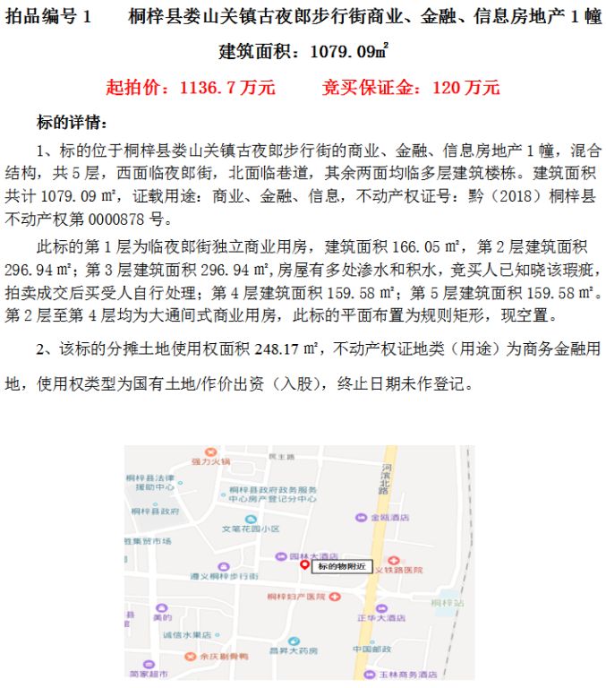 一、桐梓縣婁山關(guān)鎮(zhèn)古夜郎步行街商業(yè)、金融、信息房地產(chǎn)1幢(建筑面積1079.09㎡)