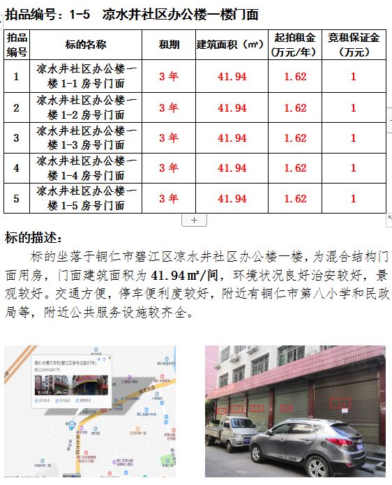 1、涼水井社區(qū)辦公樓一樓門(mén)面5間1-1、1-2、 1-3、 1-4、 1-5)3年租賃權(quán)(建筑面積:41.94㎡/間);起拍租金單價(jià)(每間):1.62萬(wàn)元/年;競(jìng)租保證金(每間):1萬(wàn)元;