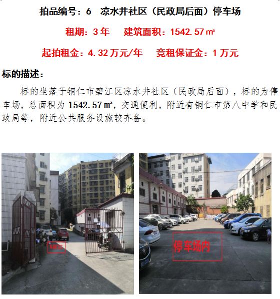 2、涼水井社區(qū)(民政局后面)停車(chē)場(chǎng)3年租賃權(quán)(建筑面積:1542.57㎡);起拍租金:4.32萬(wàn)元/年;競(jìng)租保證金:1萬(wàn)元;