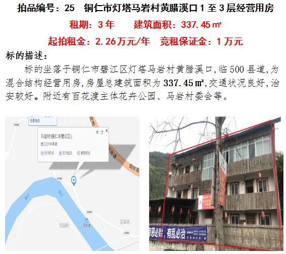 6、銅仁市碧江區(qū)燈塔馬巖村黃臘溪口1-3層經(jīng)營(yíng)房3年租賃權(quán)(建筑面積:337.45㎡);起拍租金單價(jià):2.26萬(wàn)元/年;競(jìng)租保證金:1萬(wàn)元;