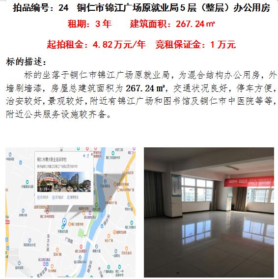 5、銅仁市錦江廣場(chǎng)原就業(yè)局第五樓辦公用房3年租賃權(quán)(建筑面積:267.24㎡);起拍租金單價(jià):4.82萬(wàn)元/年;競(jìng)租保證金:1萬(wàn)元;