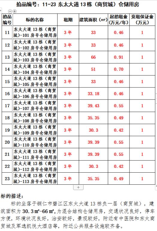 4、東太大道13棟(商貿(mào)城)倉(cāng)儲(chǔ)(13間)3年租賃權(quán)(建筑面積30.3㎡-66㎡/間);起拍租金單價(jià)(每間):0.42萬(wàn)元/年-0.91萬(wàn)元/年;競(jìng)租保證金(每間):1萬(wàn)元;