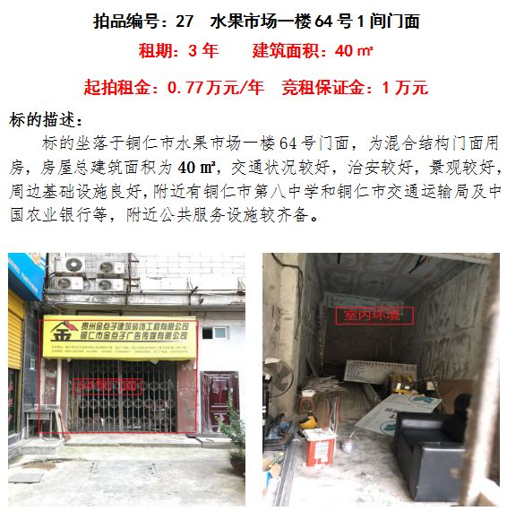 8、銅仁市水果市場(chǎng)一樓64號(hào)門(mén)面3年租賃權(quán)(建筑面積:40㎡);起拍租金單價(jià):0.77萬(wàn)元/年;競(jìng)租保證金:1萬(wàn)元;