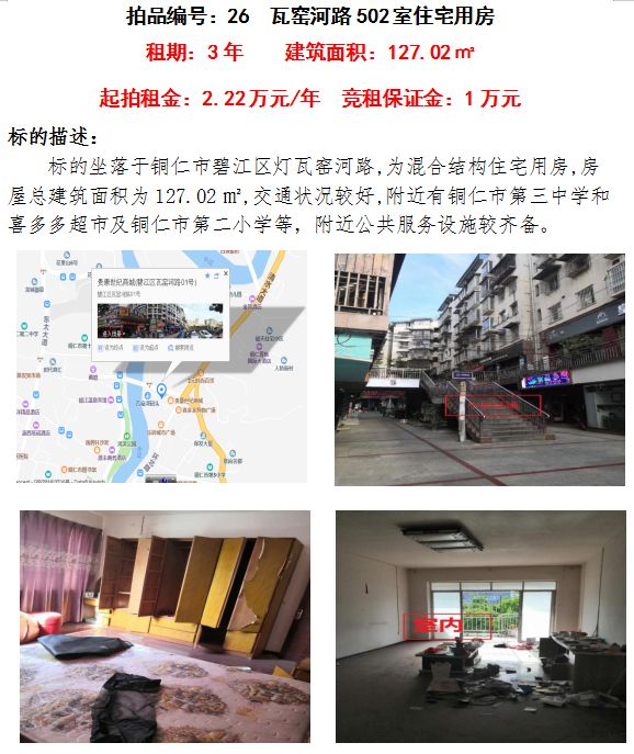 7、銅仁市碧江區(qū)瓦窯河路502室住宅用房3年租賃權(quán)(建筑面積:127.02㎡);起拍租金單價(jià):2.22萬(wàn)元/年;競(jìng)租保證金:1萬(wàn)元;