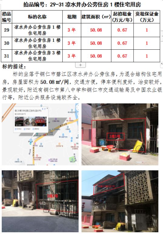11、銅仁市碧江區(qū)涼水井辦公旁住宅用房三間3年租賃權(quán)(建筑面積:50.08㎡/間);起拍租金單價(jià)(間):0.67萬(wàn)元/年;競(jìng)租保證金:1萬(wàn)元;