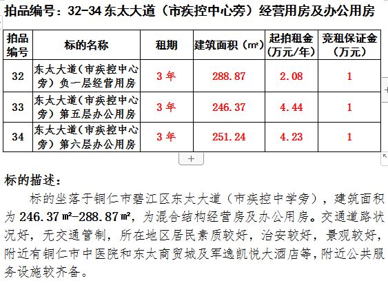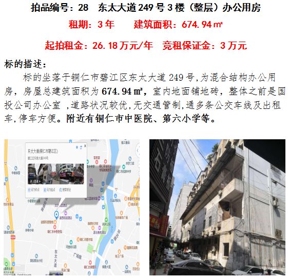 10、銅仁市碧江區(qū)東太大道249號(hào)辦公室3年租賃權(quán)(建筑面積:674.94㎡);起拍租金單價(jià):26.18萬(wàn)元/年;競(jìng)租保證金:3萬(wàn)元;